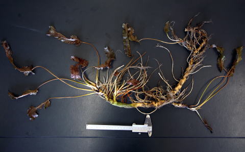 図1:シモツケコウホネ.成長点は根茎の先端にあり、葉や花は長い根茎の先に束生する.