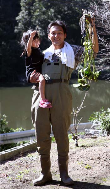右の写真:現在の私(28)と娘(2)とオグラコウホネ(兵庫県三田市にて).娘がもっているのはオグラノフサモ.